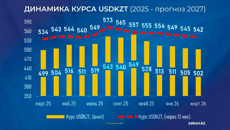 На горизонте года средний прогноз также стал более оптимистичным: 542,1 тенге за доллар против 544,7 тенге в предыдущем опросе.