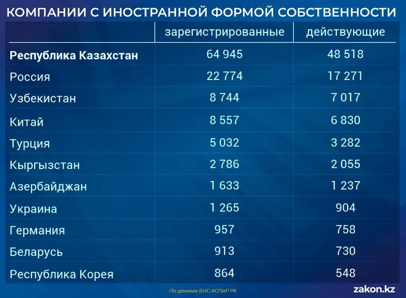 Снижение зафиксировано по нескольким направлениям. Турция сократила присутствие своих компаний в РК с 5 204 до 5 032, Кыргызстан – с 3 116 до 2 786, Украина – с 1 319 до 1 265, Республика Корея – с 876 до 864.