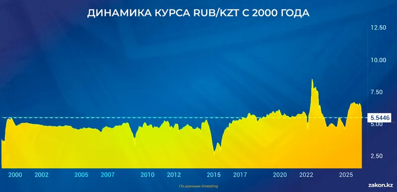 Если смотреть на график динамики пары RUB/KZT с 2000 года, то есть, за последние 25 лет, становится видно, что паритет 1:5,5 формировался постепенно. С начала 2000-х и примерно до 2014 года курс держался около 5 тенге за рубль. Это был период синхронного движения экономик, когда обе валюты зависели от сырьевого цикла, а девальвации не ломали соотношение. Именно этот баланс стал отправной точкой для всех последующих отклонений.