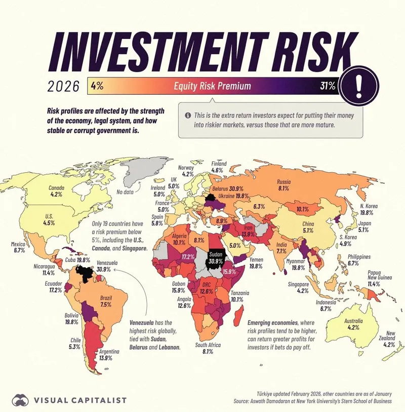 Инвестиционная привлекательность государства строится на прямой математической зависимости: чем ниже премия за риск, тем выше доверие инвесторов и стабильнее экономика. Премия за риск (Equity Risk Premium, ERP) – это, по сути, "плата за страх". Она показывает, сколько дополнительных процентов доходности должен пообещать рынок, чтобы инвестор согласился вложить деньги в активы этой страны вместо безрисковых инструментов, таких как государственные облигации США.