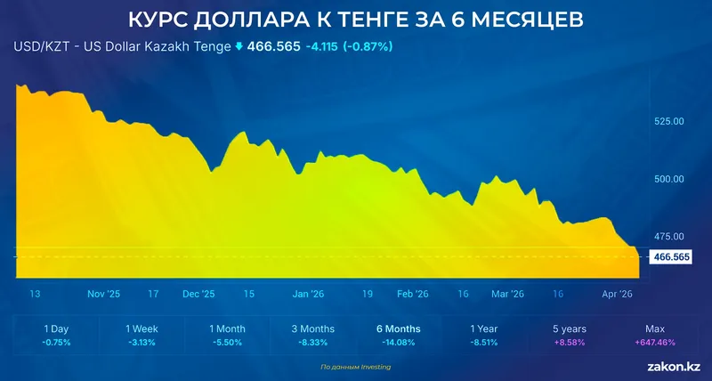 Если же сравнивать с октябрем 2025 года, когда курс достигал 547,57 тенге, снижение составило 14,7%, или 80,5 тенге!