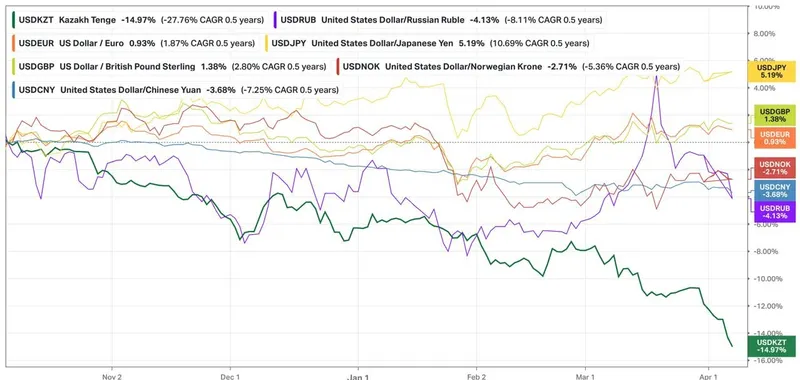 По данным платформы Koyfin (международная онлайн-платформа для анализа финансовых рынков), за последние 6 месяцев тенге показал невероятную динамику.