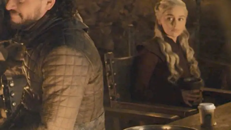 В одном из эпизодов четвертой серии на экране появляется героиня Дейенерис Таргариен с предметом, неуместным в средневековом мире. Речь идет о пластиковом стакане с кофе из американской сети кофеен.