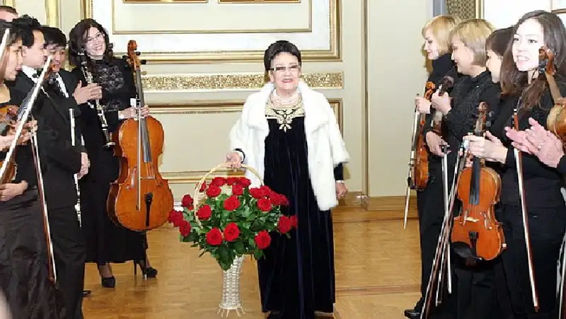 На одном из концертов закрыли занавес, поставили постамент, постелили на него ковер, подушки, корпешки, красивые покрывала и на сцену под ручку вывели бабушку. Это была Дина Нурпеисова, я впервые в жизни ее увидела тогда своими глазами, а не на картинах или фотографиях. Мне было так интересно, я задавалась вопросами: «Зачем это надо? Столько ей лет, ее тащат на сцену». Она начала играть на домбре свои произведения, великолепно их исполнила, потом закрыли занавес, увели ее, и продолжился концерт.