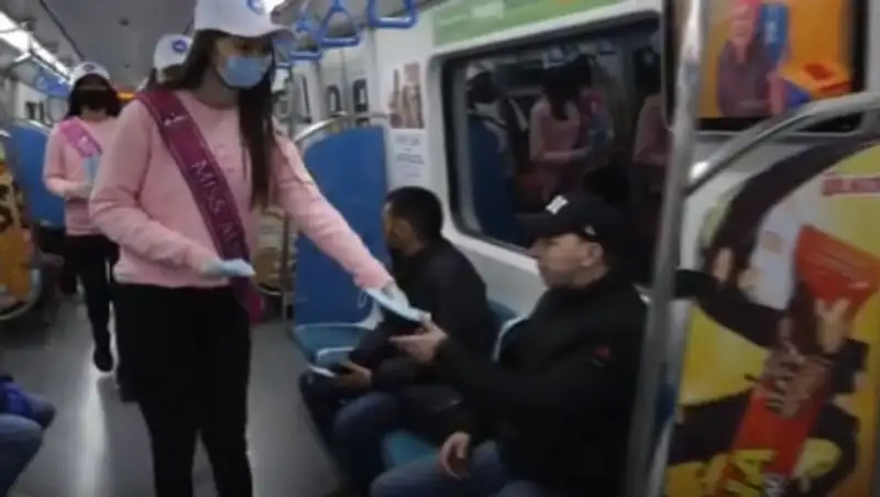 14 человек в масках раздачу масок алматинцам начали с алматинского Арбата, продолжили в алматинском метро, общественном транспорте и возле продуктовых магазинов.
