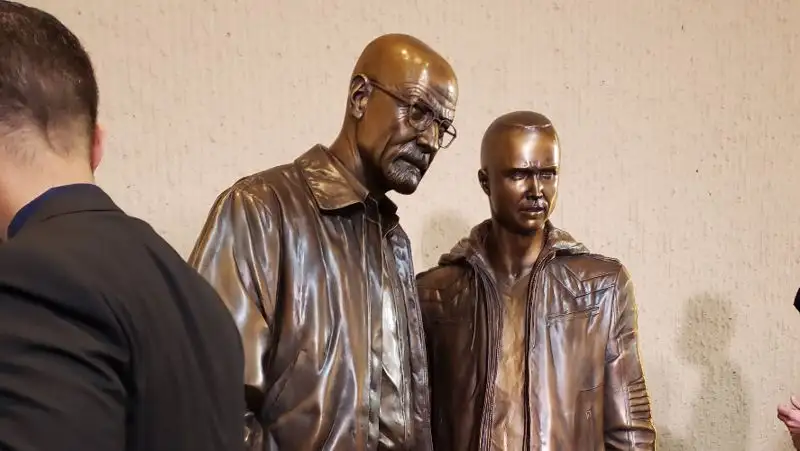 Полотно со статуй сорвали исполнители главных ролей сериала – Брайан Крэнстон и Аарон Пол, передает Consequence.