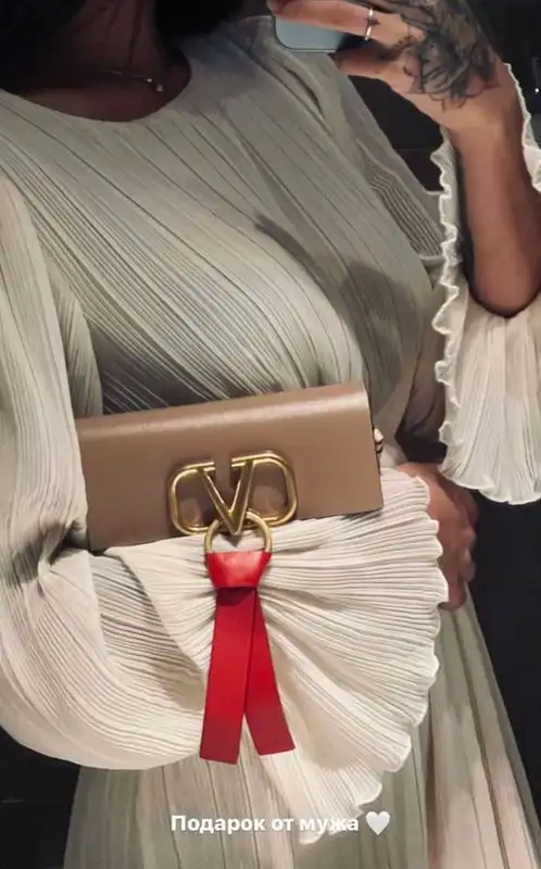 В Stories она показала подарок, который получила от мужа, – мини-сумку от итальянского бренда Valentino Garavani.