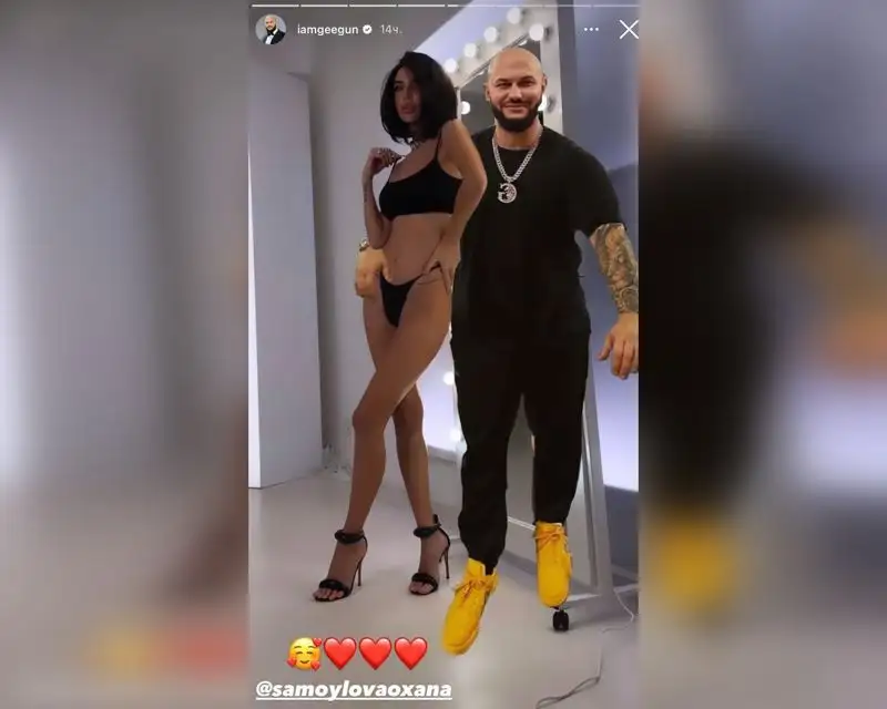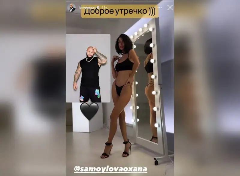 Сначала в Instagram-Stories Джиган разместил фото Самойловой в полный рост, поместив рядом с супругой свой снимок. На фото Оксана позирует в черном нижнем белье и в босоножках на шпильках.