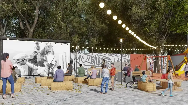 Кроме того, уличный ансамбль дополнит креативный перфорированный фасад с арт-объектом в стиле граффити, а также кинотеатр под открытым небом.