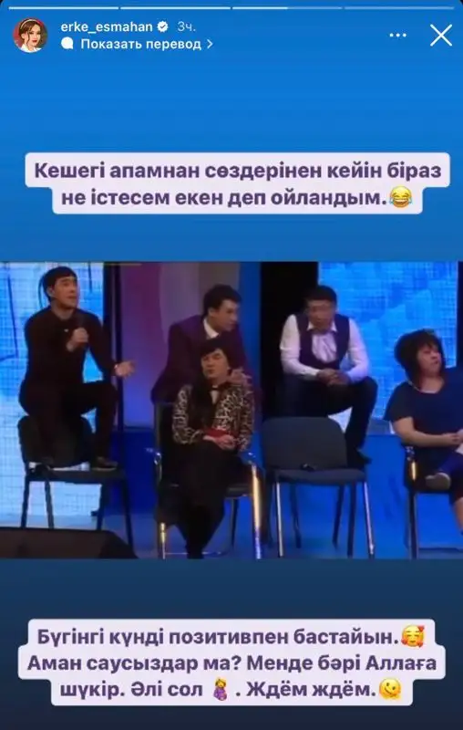 "Решила начать сегодняшний день с позитива. Как вы? У меня все слава Богу. До сих пор беременная. Ждем-ждем", – заключила Ерке Есмахан.
