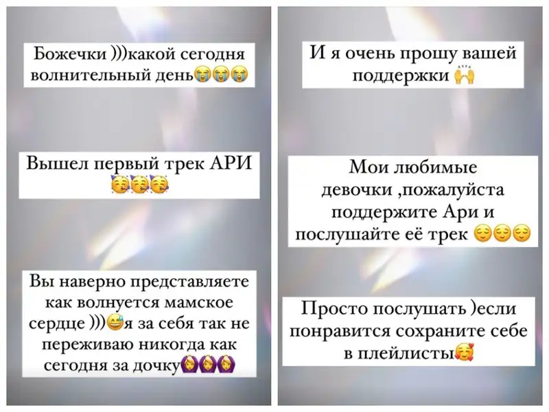 "Вышел первый трек Ари. Вы, наверное, представляете, как волнуется мамское сердце. Я за себя так не переживаю никогда, как сегодня за дочку. И я очень попрошу вашей поддержки... Если понравится, сохраните себе в плейлисты", – написала Оксана Самойлова, обращаясь к своим фанатам.