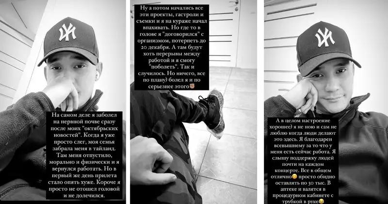 "Я на кураже начал впахивать. Но где-то в голове "договорился" с организмом потерпеть до 20 декабря. А там будут хоть перерывы между работой и я смогу "поболеть". Так и случилось. Но ничего, все по плану. Болел я и посерьезнее этого. Я не ною и сам не люблю, когда люди делают это здесь. Я благодарен за то, что у меня есть сейчас работа. Я слышу поддержку людей почти на каждом концерте. Все отлично. Просто обидно оставлять по 30 тысяч в аптеке и валяться в процедурном кабинете с трубкой в руке".Али Окапов