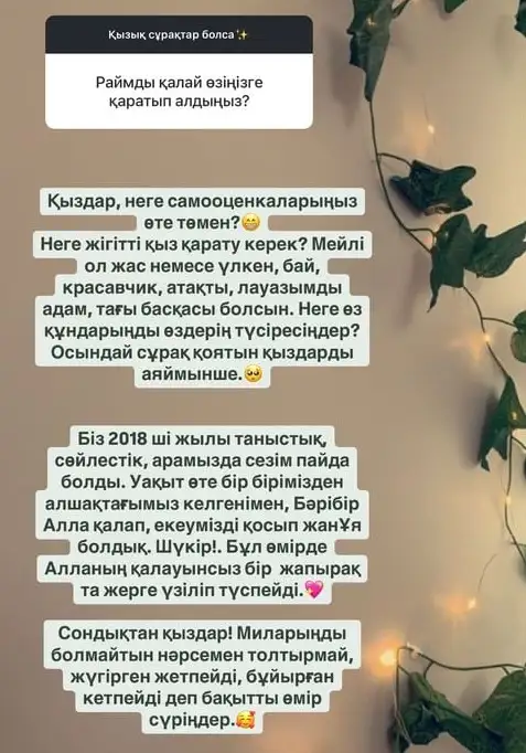 Напомним, Ерке и Raim в январе 2023 года провели ритуал неке қию и стали супругами по канонам ислама. 24 августа они подтвердили слухи о том, что ждут ребенка. 23 ноября супруги стали родителями.