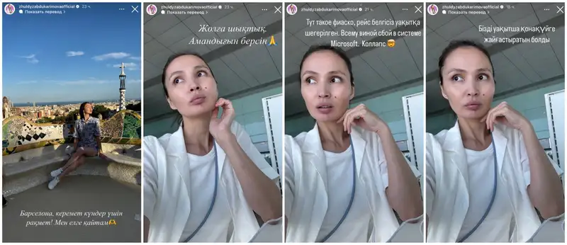 "Тут такое фиаско, рейс отложен на неопределенное время. Всему виной сбой в системе Microsoft. Коллапс... Нас решили временно разместить в отеле", – написала Жулдыз Абдукаримова накануне, 25 июля 2024 года.