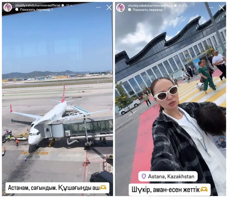Затем актриса сообщила, что они благополучно долетели до аэропорта Стамбула. А уже сегодня, 26 июля, Жулдыз опубликовала видео из аэропорта Астаны.