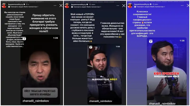 "Мой новый "герой" все никак не может "катын" унять?! Жду теперь, когда он скажет, что женщина должна начать день с глубокого поклона мужу и поцелуев в ноги... Тогда еще больше жанаттык айел боласын... Главное довольство мужа. Женщине необязательно – она недочеловек! И вот это мракобесие у нас повсеместно", – добавила Баян Алагузова.