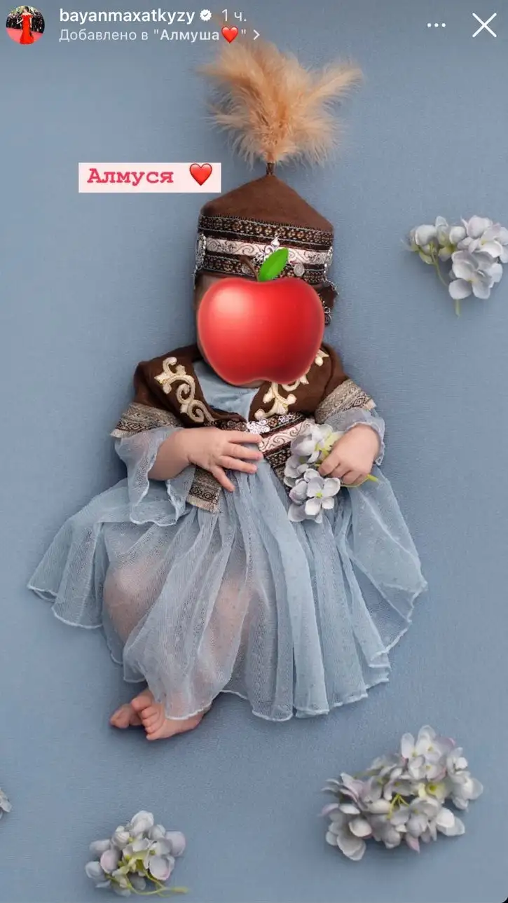 Далее она разместила фотографию самой Алмы, правда, лицо Баян Алагузова прикрыла смайликом. На снимке девочка одета в казахскую национальную одежду.