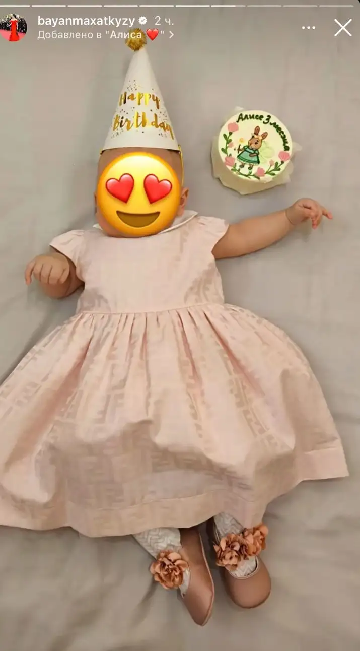 На одном фото Алиса позирует в нежном персиковом платье, а рядом расположился бенто-тортик с надписью "Алисе 3 месяца".