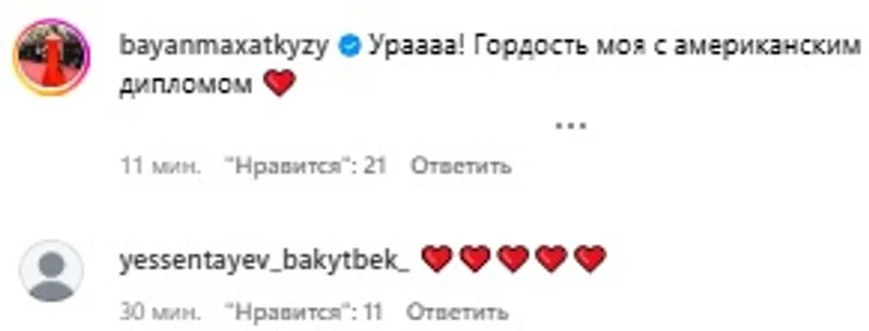 "С днем рождения, моя кровинушка. Я люблю тебя! Как же чудесно, что мы есть друг у друга!... Крошка теперь не крошка, а дипломированный специалист. Закончила универ раньше времени, в день своего 21-летия", – написала Айсауле Бакытбек-Кайдарова.