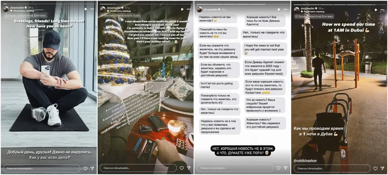 "Я отсутствовал в соцсетях около двух месяцев. У меня все очень хорошо, спасибо! В данный момент я нахожусь в Дубае и скоро полечу в Казахстан отмечать Новый год с семьей! Я рад, что вы скучали, я тоже по всем скучал! В следующем году у меня будут для вас хорошие новости!" – написал Димаш Адилет.
