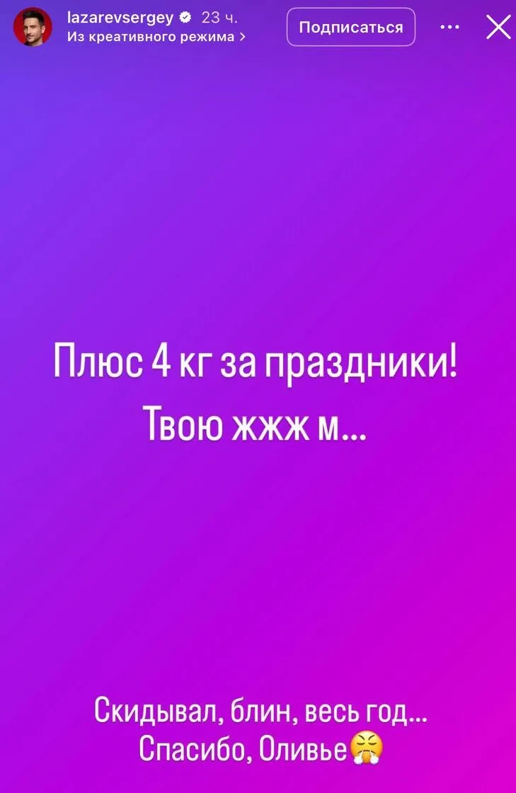 У себя в Instagram-сторис артист выразил разочарование в праздниках, из-за которых вся его работа над физической формой оказалась напрасной. Со слов Лазарева, Новый год и Рождество уничтожили результаты годичной работы певца над своей фигурой. Под раздачу попал символ новогоднего стола – салат Оливье.