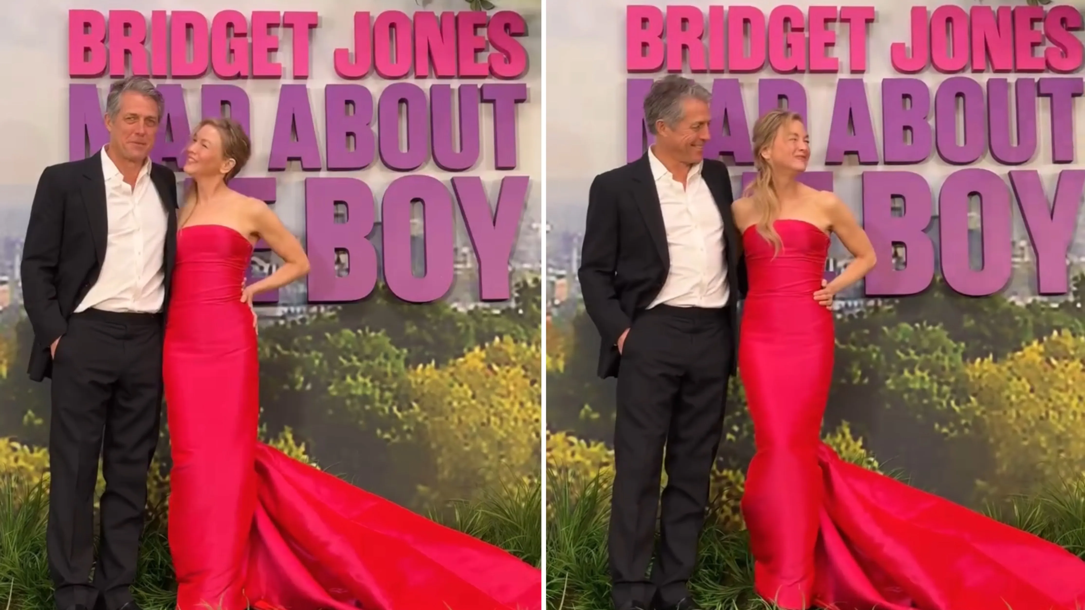 Теперь 55-летняя Зеллвегер и 64-летний Грант продвигают в Париже фильм "Бриджит Джонс: Без ума от мальчика". Для выхода актеры выбрали парные образы. Рене надела кружевное платье на одно плечо с разрезом от бедра. Грант был одет в традиционный ансамбль из черного костюма и рубашки, аналогичный наряду, который он носил на премьере 20 с лишним лет назад.