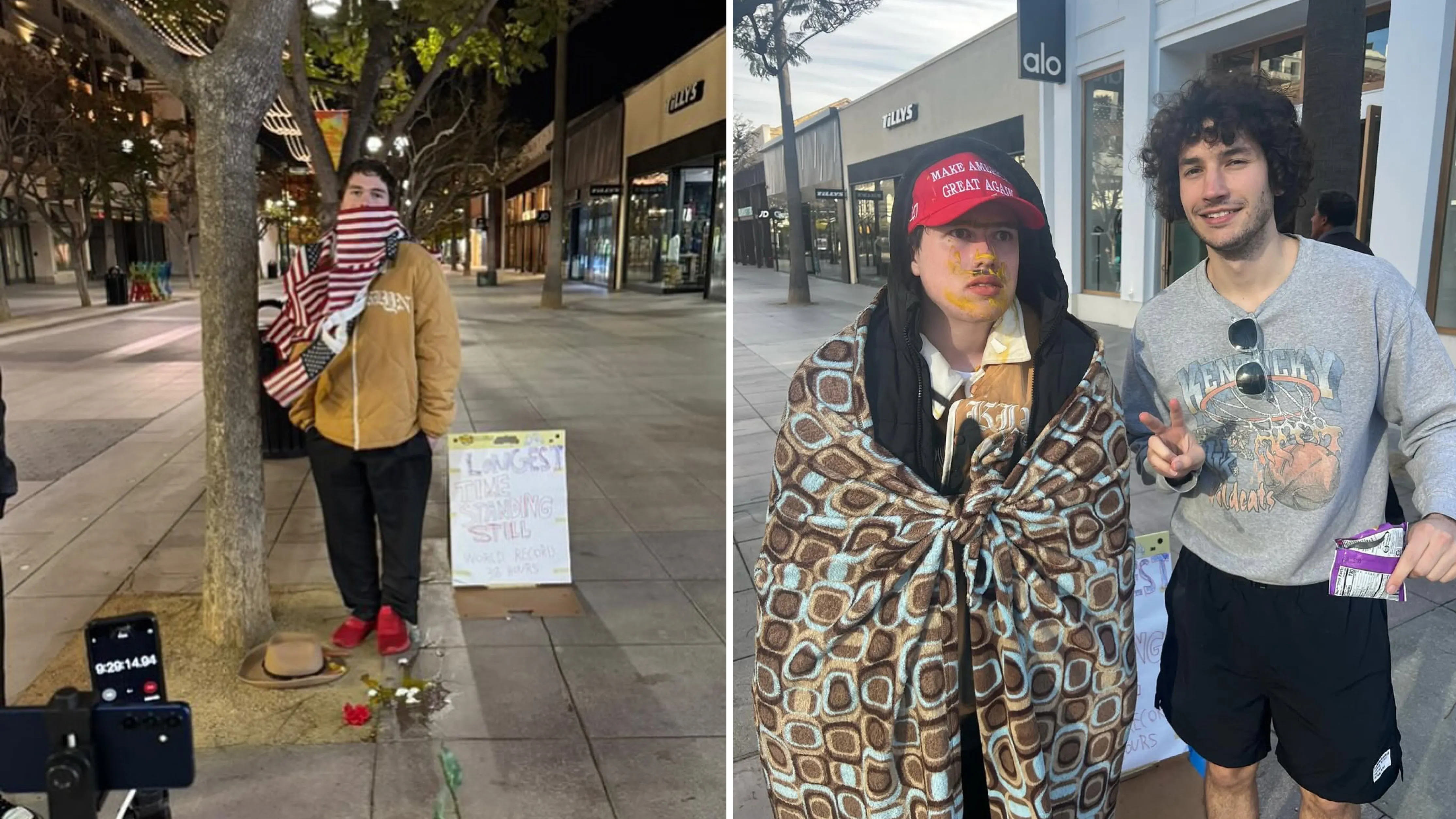 По правилам челленджа, он не мог садиться, опираться или менять позу. В таком положении мужчина продержался 38 часов. Чтобы он не упал в обморок, друзья подкармливали его пиццей.