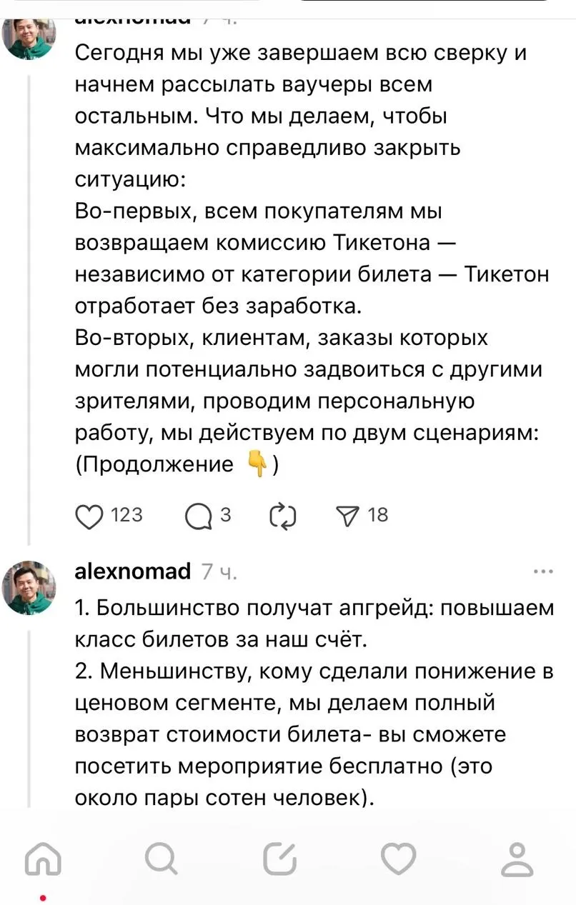 12 апреля посты с последующими пояснениями из-за неоднозначной ситуации на сайте выпустил на своей странице в Threads глава Ticketon. С его слов, во всем виноваты технари, которые не учли ряд нюансов.