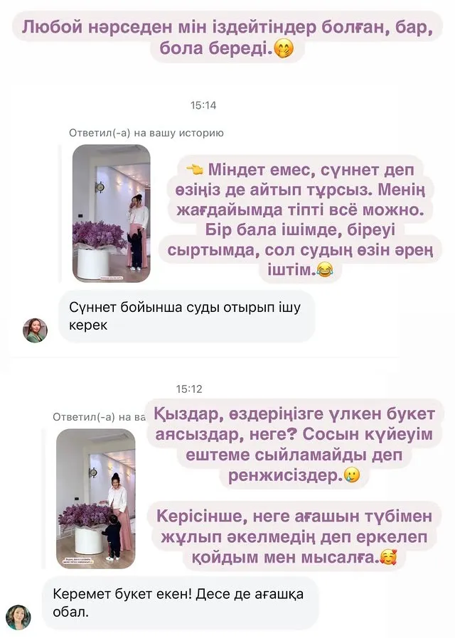 "Вы сами же пишите, что не обязанность, а Сунна. В моей ситуации можно все. Один ребенок внутри, другой – рядом, я ту воду еле выпила", – ответила Есмахан подписчице, которая написала артистке в директ, что воду по Сунне нужно пить сидя.