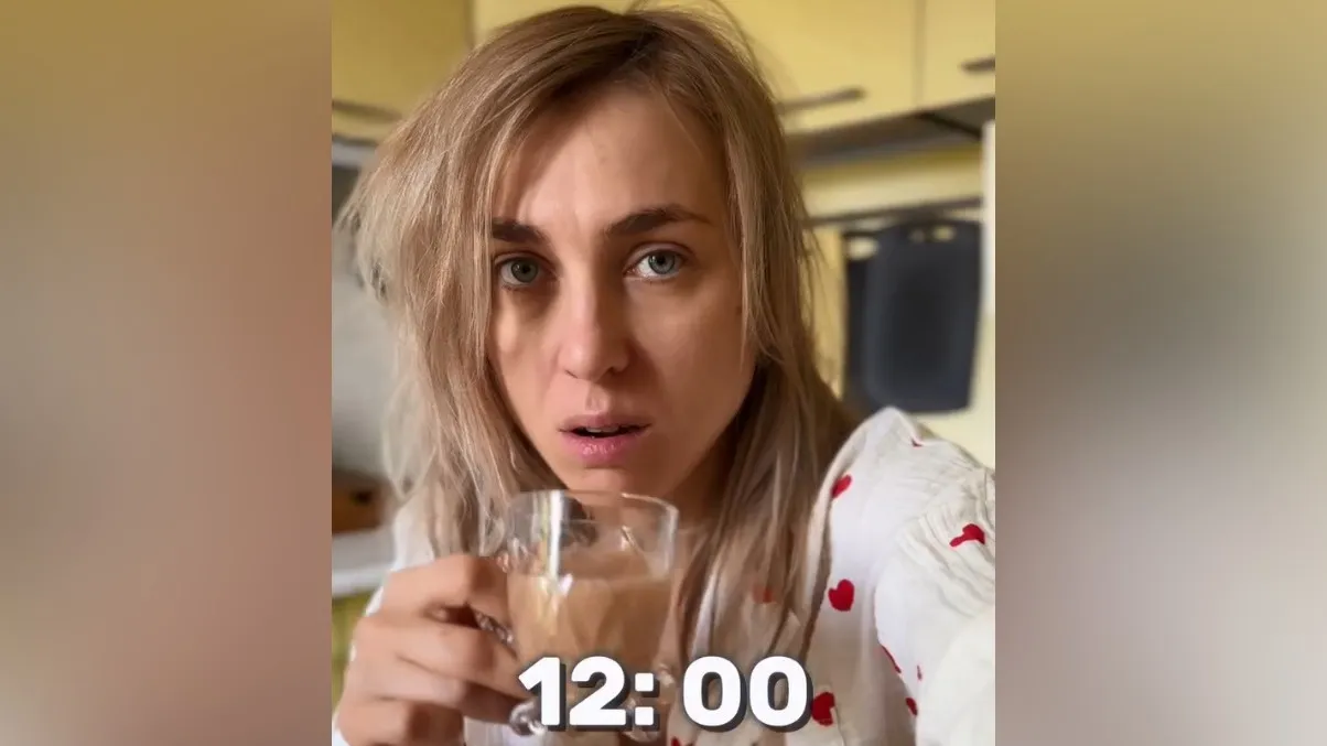 На кадрах можно увидеть девушку, которая проснулась рано в 05:00 и успела до 09:00 сделать утреннюю зарядку, приготовить себе завтрак, собраться, заехать в зал, чтобы потренироваться. Затем картина резко меняется, и можно увидеть растрепанную и немножко растерянную Татьяну, которая, по всей видимости, проснулась в 12:00.