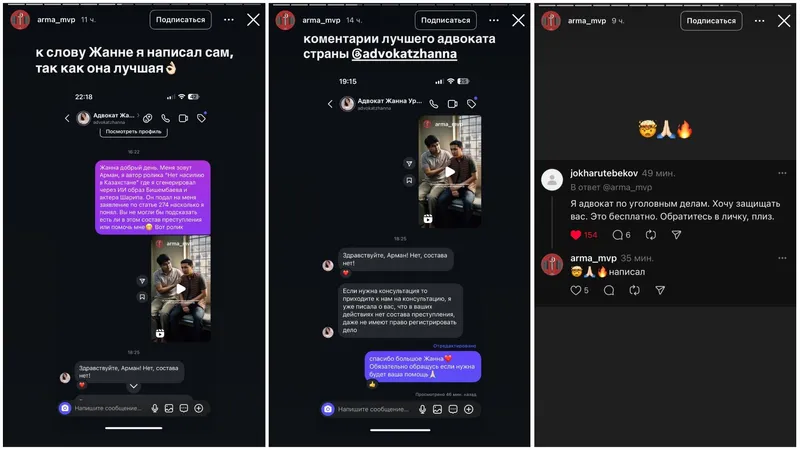 Также ИИ-креатор опубликовал скриншоты переписок с известными адвокатами: Жанной Уразбаховой (представляла семью убитой Салтанат Нукеновой по делу Куандыка Бишимбаева) и Джохаром Утебековым. По словам Уразбаховой, в созданном Арманом видео состава преступления нет. А Утебеков предложил креатору защищать его на бесплатной основе.