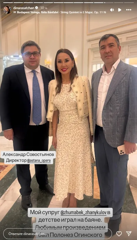 Накануне, 6 мая 2025 года, в Astana Opera прошел гала-концерт, организованный в честь Дней культуры Вьетнама в Казахстане. Кадрами с мероприятия 42-летняя Динара поделилась в Instagram-Stories. На одном из них она позирует между директором столичного Оперного театра Александром Совостьяновым и своим мужем.