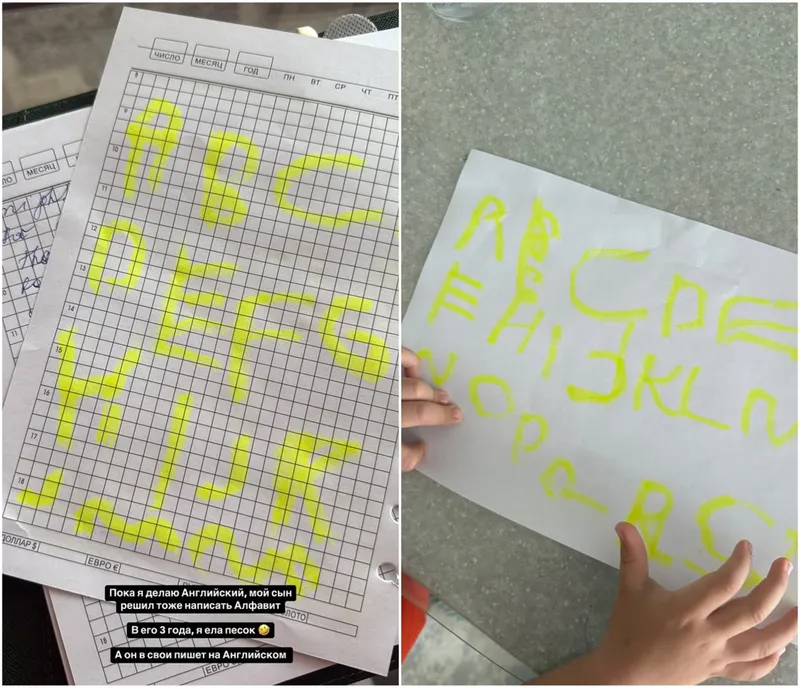 "Пока я делаю английский, мой сын решил тоже написать алфавит", – написала Сабина в Stories 8 мая 2025 года.