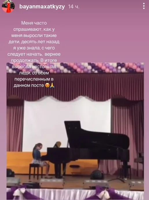 В Instagram-stories Баян Алагузова опубликовала фото с дочерью Айару, где она играет на сцене на фортепиано.