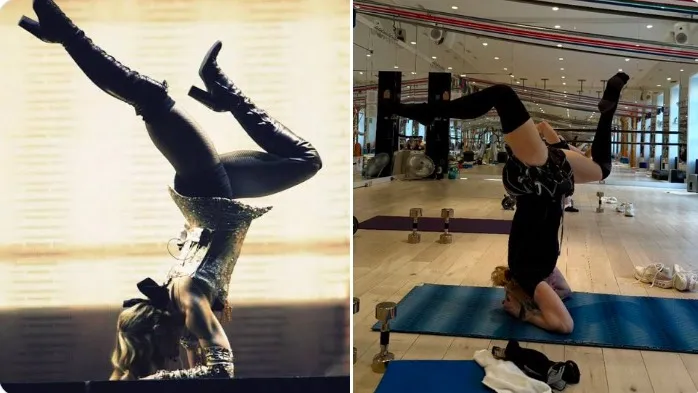 Опора на руки и голову, подъем корпуса вертикально и затем приведение ног в красивое положение. Такой трюк звезда сделала 21 год назад на открытии своего мирового турне Re-Invention в Los Angeles Forum.