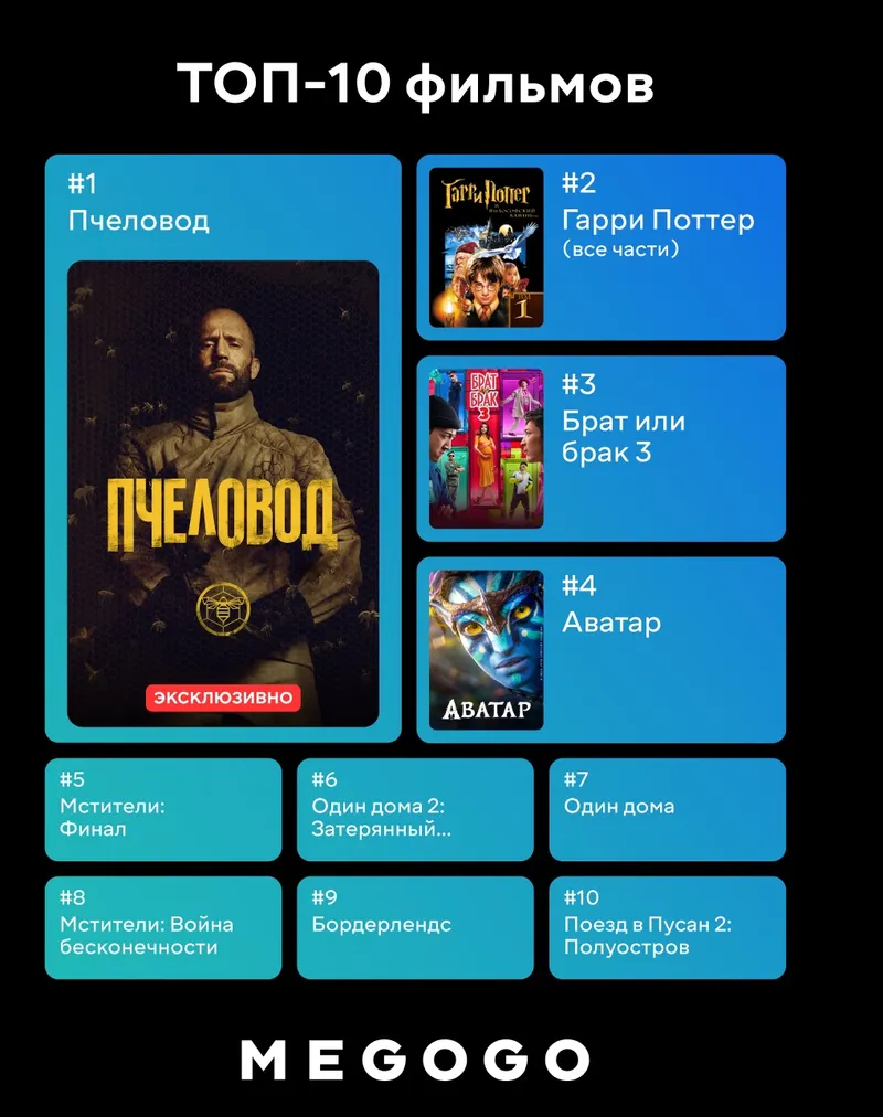 Казахстанцы по-прежнему отдают предпочтение динамичному кино. В лидерах – свежие боевики, фантастика и культовые франшизы. "Пчеловод" с Джейсоном Стэйтемом стал настоящим хитом. В топ также вошли все части полюбившейся саги о Гарри Поттере, уже ставшая классикой новогодняя комедия "Один дома" и супергеройские блокбастеры Marvel. Также фаворитом оказалась казахстанская комедия "Брат или брак 3", уверенно закрепившаяся среди лидеров.