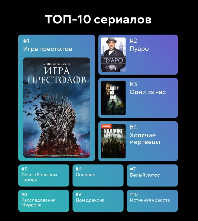 Среди сериалов уверенное лидерство у "Игры престолов", за которой следуют "Одни из нас", "Секс в большом городе" и "Дом дракона". Казахстанцы охотно смотрят как громкие современные хиты, так и культовые классические проекты вроде "Пуаро" или "Сопрано". Также в топе корейская дорама "Истинная красота", укрепившая позиции K-драм на платформе.