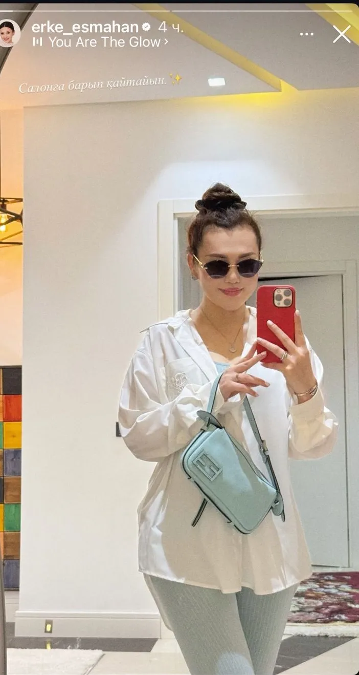 На фото Ерке позирует у зеркала в расслабленном, но стильном образе: свободная белая рубашка, светло-голубые лосины и сумка Fendi. Волосы собраны в аккуратный пучок, лицо – без яркого макияжа.