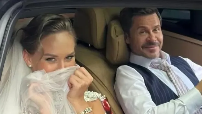Невеста для важного дня выбрала роскошное белое кружевное платье со шлейфом и закрытым декольте, а на голове закрепила минималистичную длинную фату. Жених же прибыл на церемонию в черном костюме в полоску, белой рубашке с бежевым галстуком в горох и кроссовках.