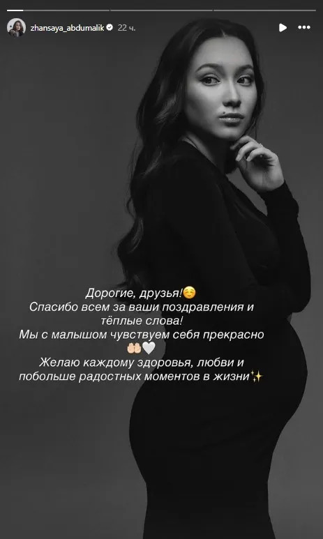 "Дорогие друзья! Спасибо всем за ваши поздравления и теплые слова! Мы с малышом чувствуем себя прекрасно. Желаю каждому здоровья, любви и побольше радостных моментов в жизни", – написала Абдумалик 10 августа в Stories.