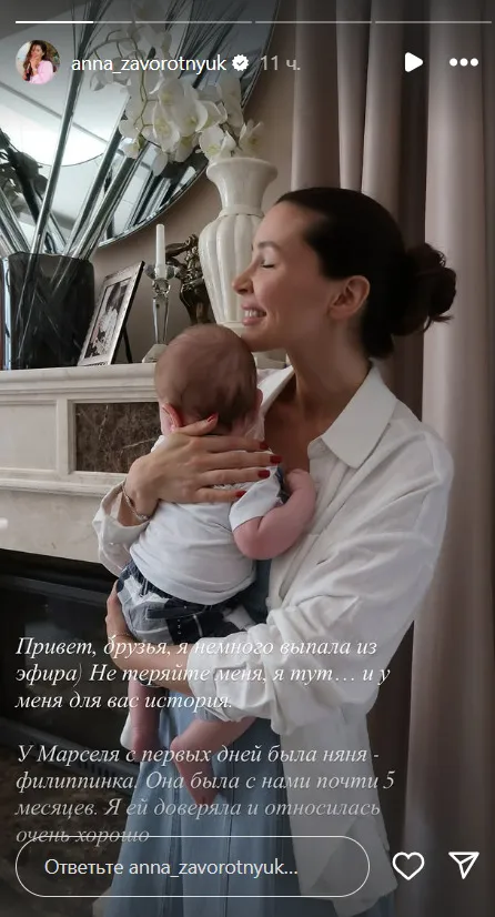 "Друзья, хочу поделиться историей, которая со мной произошла. У Марселя с первых дней была няня-филиппинка. Она работала почти пять месяцев, и я очень хорошо к ней относилась. Доверяла, ценила, старалась быть максимально открытой и доброй. Перед ее выходным я отдала ей зарплату, собрала пакеты с подарками. Она уехала счастливая и довольная И вдруг… тишина. Она не выходила на связь несколько дней. Я уже начала переживать: а вдруг что-то случилось? Потом она написала, что заболела. Но на звонки так и не ответила, только изредка присылала короткие сообщения. Я предлагала вызвать врача, она отказалась", – поделилась 29-летняя Заворотнюк.