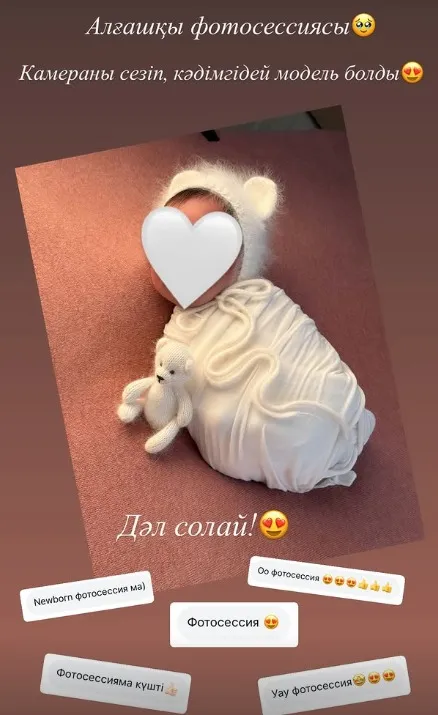 Чуть ранее 37-летняя Жулдыз пообещала фолловерам показать кое-что интересное, и многие подписчики догадались, что это будут кадры первой фотосессии малыша: