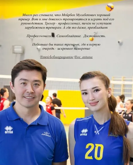 "Много раз слышала, что Мейрбек Мусабекович хороший тренер. Вот и мне довелось тренироваться и играть под его руководством. Тренер – профессионал, ничем не уступает зарубежным тренерам. А где-то даже преобладает. Профессионализм. Самообладание. Достойность", – написала Алтынбекова в Stories сегодня, 10 сентября.