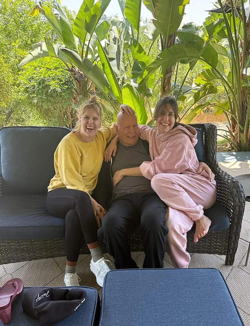На фотографии звезда боевиков позирует вместе с дочерьми Скаут и Таллулой, сидя на диване на свежем воздухе. На другом кадре Брюс обнимает наследницу.