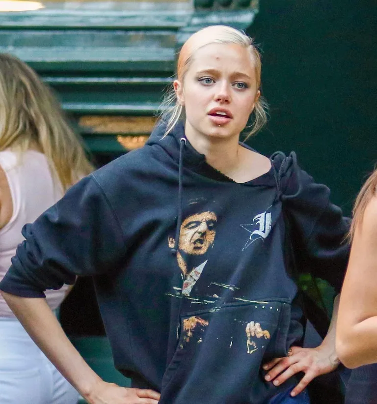 Новый имидж звездная дочь подчеркнула луком в стиле панк-рок – надела черный свитшот с изображением Тони Монтаны из фильма "Лицо со шрамом", джинсы, черные кроссовки и пирсинг под нижней губой.