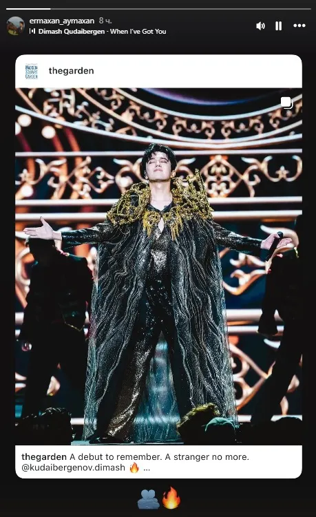 Ермахан Аймахан опубликовал в Stories фотографии Димаша, сделанные на концерте в Нью-Йорке, и сопроводил их смайликами в виде огонька.
