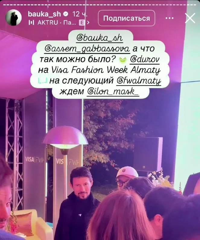 Вечером 7 октября в Алматы предприниматель Павел Дуров был замечен в числе гостей модного показа, сообщает Zakon.kz.