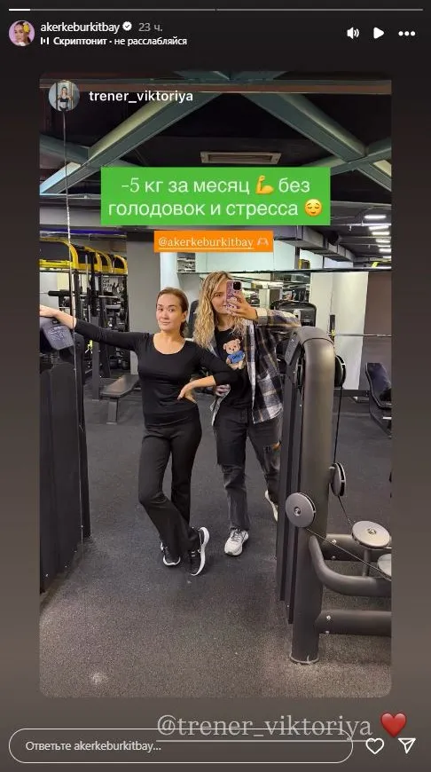 По этому поводу персональный тренер Акерке поведала в соцсетях о первых результатах музыкантки: