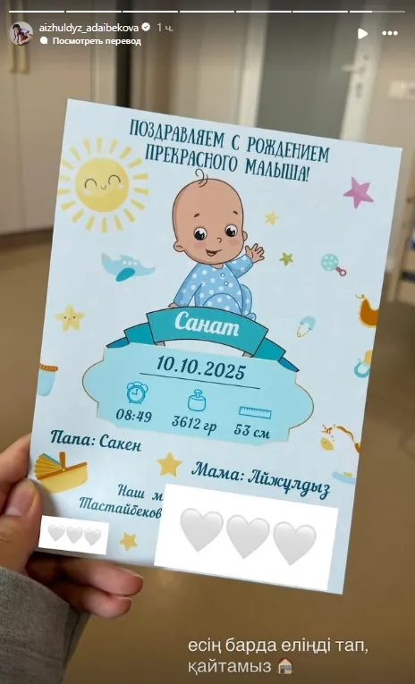 А сегодня, 14 октября, Айжулдыз сообщила поклонникам, что их с малышом выписывают из роддома.