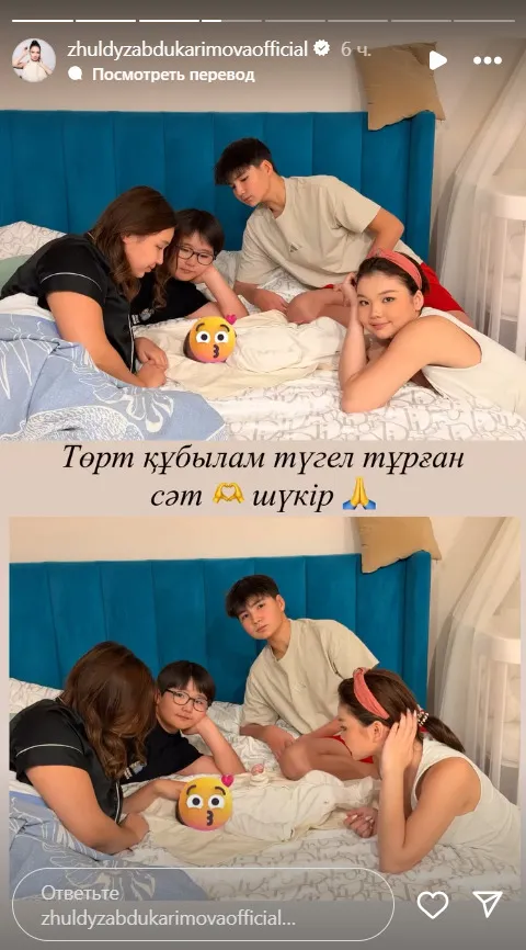 По словам Жулдыз, сейчас в их доме особая атмосфера счастья: у детей школьные каникулы, и теперь они помогают заботиться о новорожденной дочери Рабие Султан.